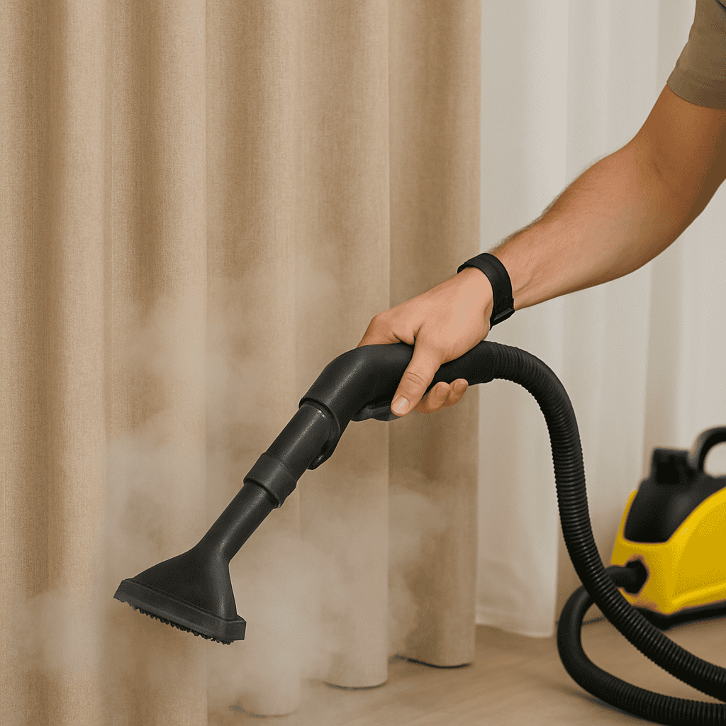 طريقة فعّالة لتنظيف وتعقيم الأقمشة وإزالة الأتربة والروائح، حيث يخترق البخار أنسجة الستارة ويساعد في تفكيك الملوثات.